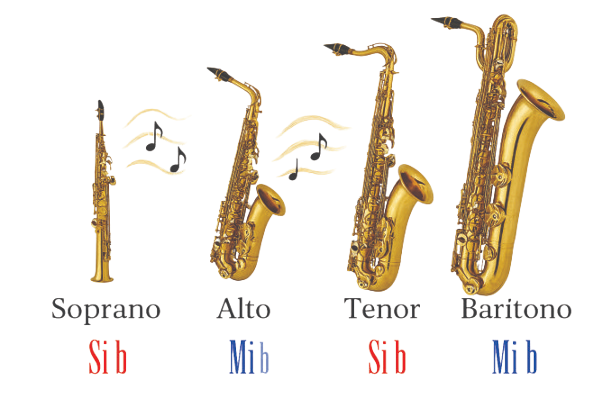Existen varios tipos de saxofón: Soprano, Alto, Tenor y Barítono. Cada uno tiene una afinación diferente, lo que significa que la digitación puede variar ligeramente.