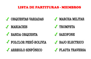 Aquí compartimos la lista de partituras que existe adicionalmente para miembros, lo cual estamos en trabajo de actualización permanente. Actualmente ya contamos con más de 35 000 mil partituras o arreglos completos compartidos.